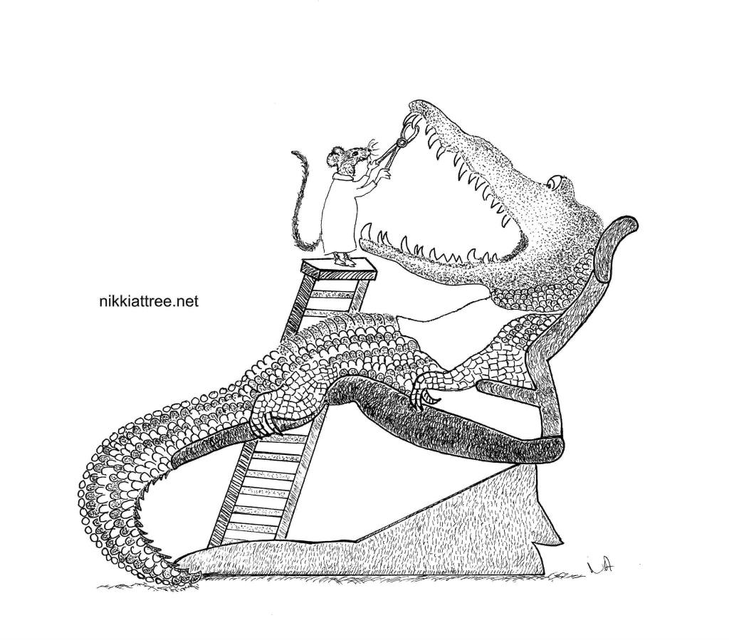 It was prompted by a recent trip to the dentist. Sitting in the chair, I imagined a large animal with lots of teeth, mouth open wide, and a small furry dentist, head in the croc’s mouth, extracting one of them.