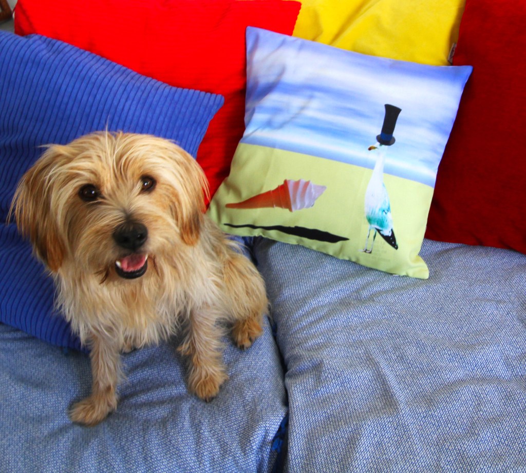 Last (but definitely not least) … a blog post wouldn’t be complete without a cute photo of Fred. So here he is with one of my pillow designs – which are available to buy from my Red Bubble shop …