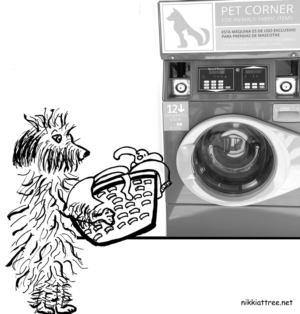 A few days ago I was at my local car wash and I noticed the garage also had a laundromat – with a machine for washing dog bedding etc. “What a wooftastic idea,” I thought and took a photo. It inspired this cartoon featuring Fred, our rescue pooch, with his toys and blankets doing his weekly wash.