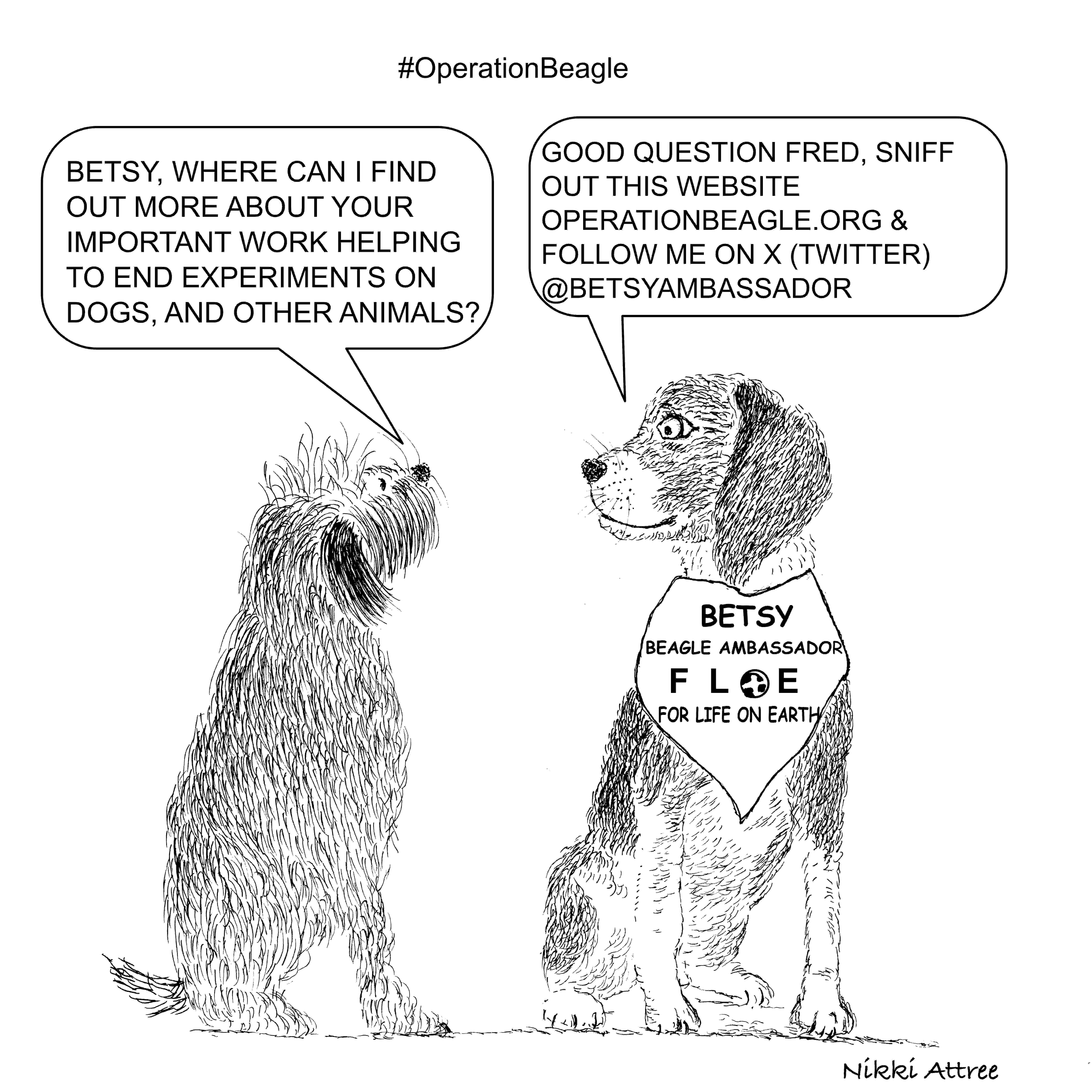 I drew this illustration of Fred and Betsy, an ambassador for Operation Beagle, and it received a lot of likes, shares, and comments on Twitter and Facebook. Betsy was rescued from a cruel breeder who supplies dogs for laboratories. She now helps FLOE (For Life On Earth) to publicise the plight of animals who are used in experiments. Check out Betsy’s website: http://operationbeagle.org/